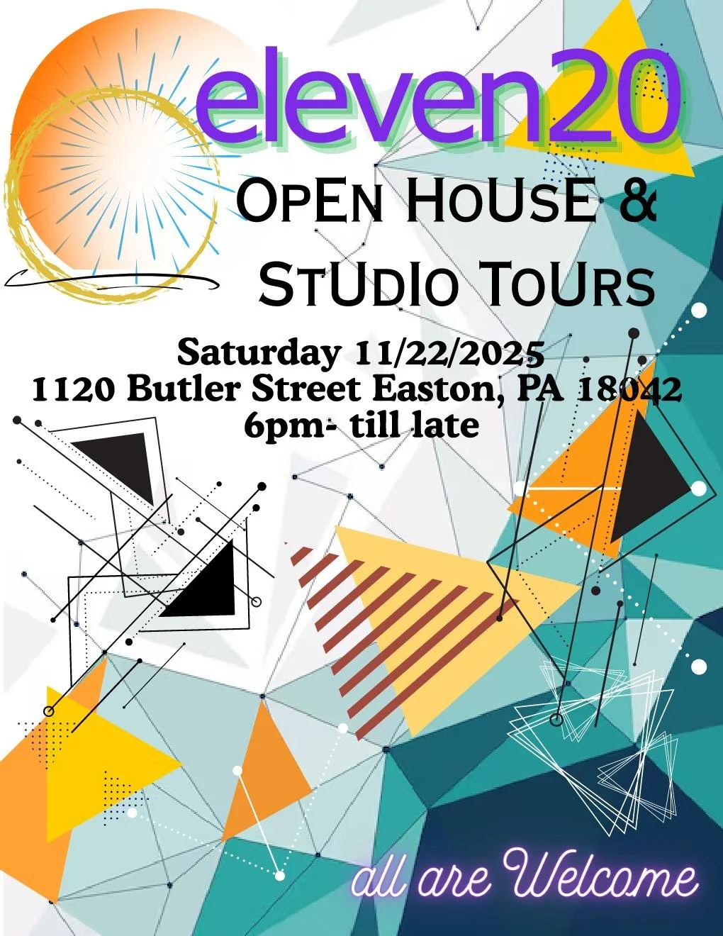 Upcoming Events Nov 22 2025 Open House Saturday, November 22, 2025 6:00 PM 6:00 PM Eleven20 Studios (map) Google Calendar ICS Our annual open house and gathering. View Event →